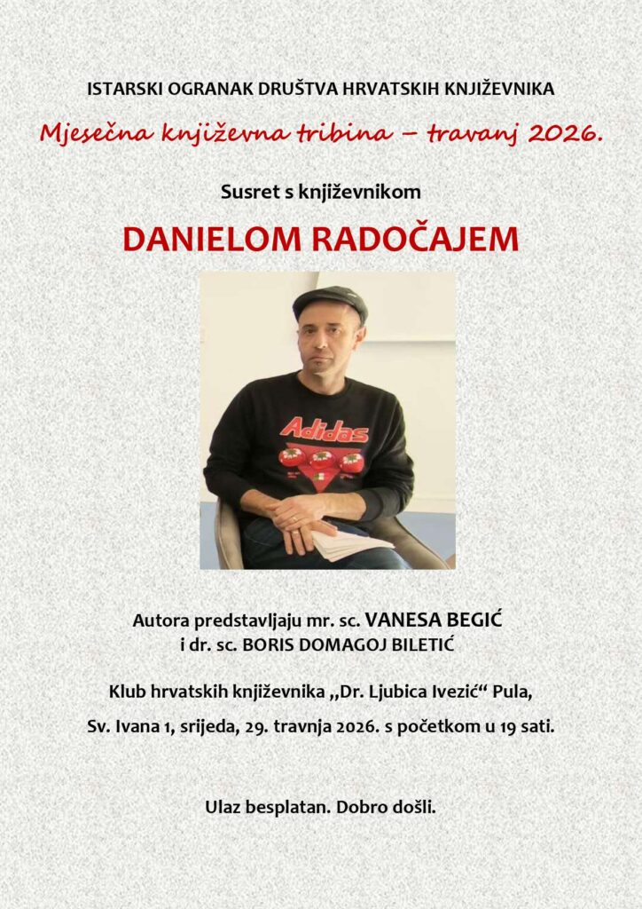 Književna tribina Istarskoga ogranka: Daniel Radočaj Objavljeno 27.04.2026 KNJIŽEVNA TRIBINA ISTARSKOGA OGRANKA DHK ZA TRAVANJ 2026.: DANIEL RADOČAJ, susret s književnikom Klub hrvatskih književnika “Dr. Ljubica Ivezić”, Sv. Ivana 1, Pula; srijeda, 29. 4. 2026. s početkom u 19 sati. 30. Šoljanovi dani u Rovinju – program