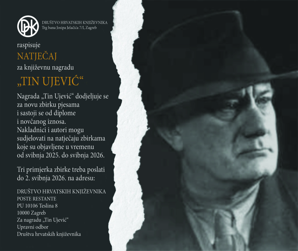 Natječaj za Nagradu „Tin Ujević“ Objavljeno 31.03.202619.03.2026 Raspisan je natječaj za književnu nagradu „Tin Ujević“, rok je do 2. svibnja 2026. godine. Mala tribina: Mladen Kopjar Bez cenzure: Jesu li naše spisateljice nadvladale književni patrijarhat?