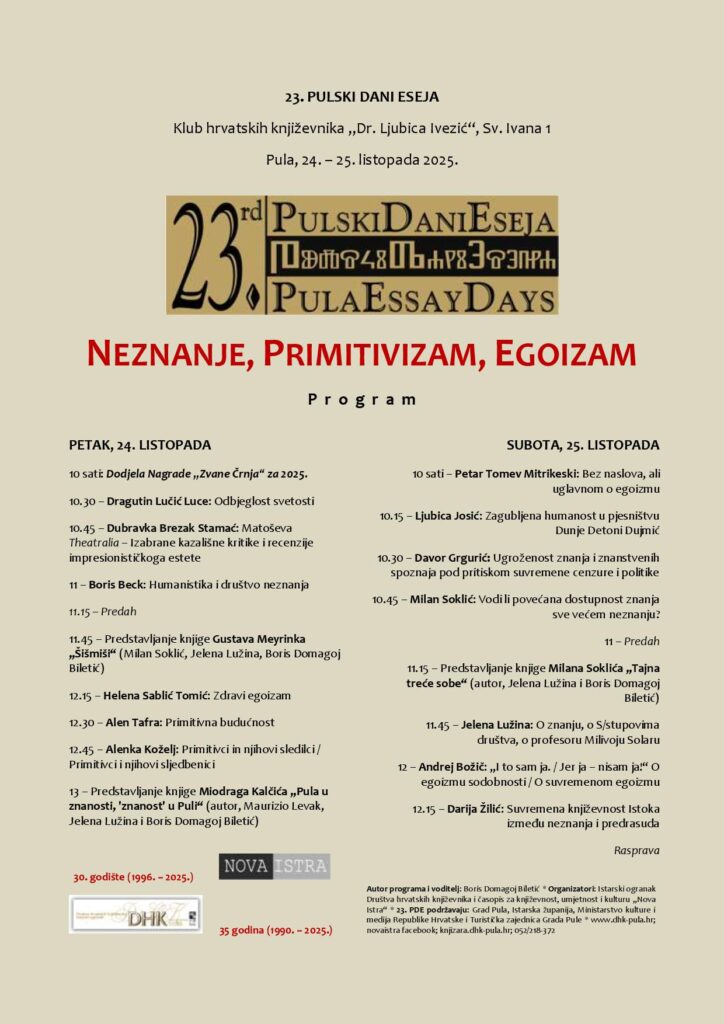 23. Pulski dani eseja, na temu “Neznanje, primitivizam, egoizam”, održat će se 24. i 25. listopada 2025. u Klubu hrvatskih književnika “Dr. Ljubica Ivezić”, Sv. Ivana 1, Pula.
