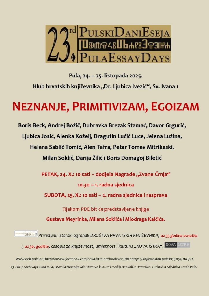 23. Pulski dani eseja, na temu “Neznanje, primitivizam, egoizam”, održat će se 24. i 25. listopada 2025. u Klubu hrvatskih književnika “Dr. Ljubica Ivezić”, Sv. Ivana 1, Pula.
