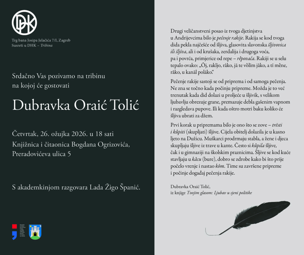 Susreti u DHK: Dubravka Oraić Tolić Objavljeno 20.03.202620.03.2026 Srdačno Vas pozivamo na tribinu na kojoj će gostovati Dubravka Oraić Tolić Četvrtak, 26. ožujka 2026. u 18 sati Knjižnica i čitaonica Bogdana Ogrizovića Preradovićeva ulica 5 S akademkinjom razgovara Lada Žigo Španić. Književni kompas u Kutini